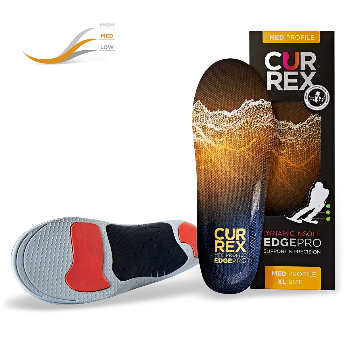 Our currexSole EDGEPRO ski insoles are the perfect answer to 100’s of ski boot fitting problems. They do this by guiding and accommodating the foot within the boot, giving better pressure distribution. This has a positive effect on the entire kinetic chain and thus reduces strain on your ankles, knees, hips and lower back as you ski. Our currexSole EDGEPRO ski insoles will help you with your balance, enable you to transfer your weight more smoothly and provide instant improved control over your ski. Whether you are a beginner or a seasoned expert – currexSole EDGEPRO insoles will help to make uncomfortable boots a thing of the past. The medium profile EDGEPRO Insoles are suitable for feet that have normal arches.