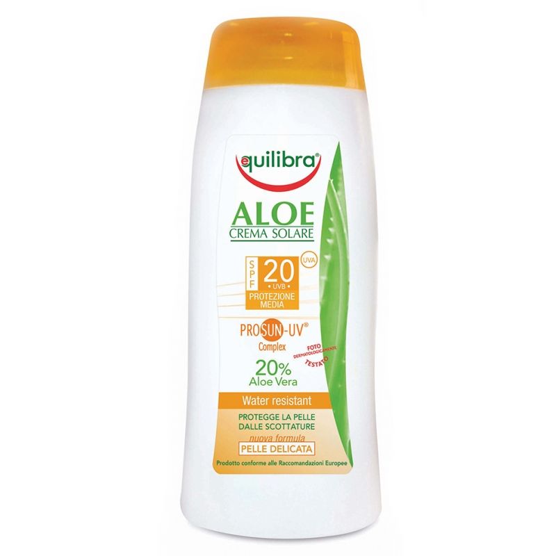 Equilibra® Aloe Sun cream SPF 20 PROSUN-UV® Complex protects the skin from burns and ensures a healty and natural suntan. Carrot oil and vitamin E stimulate the natural defenses of the skin. The tolerability of the phototested product is reinforced by the presence of aloe and the absence of perfume.