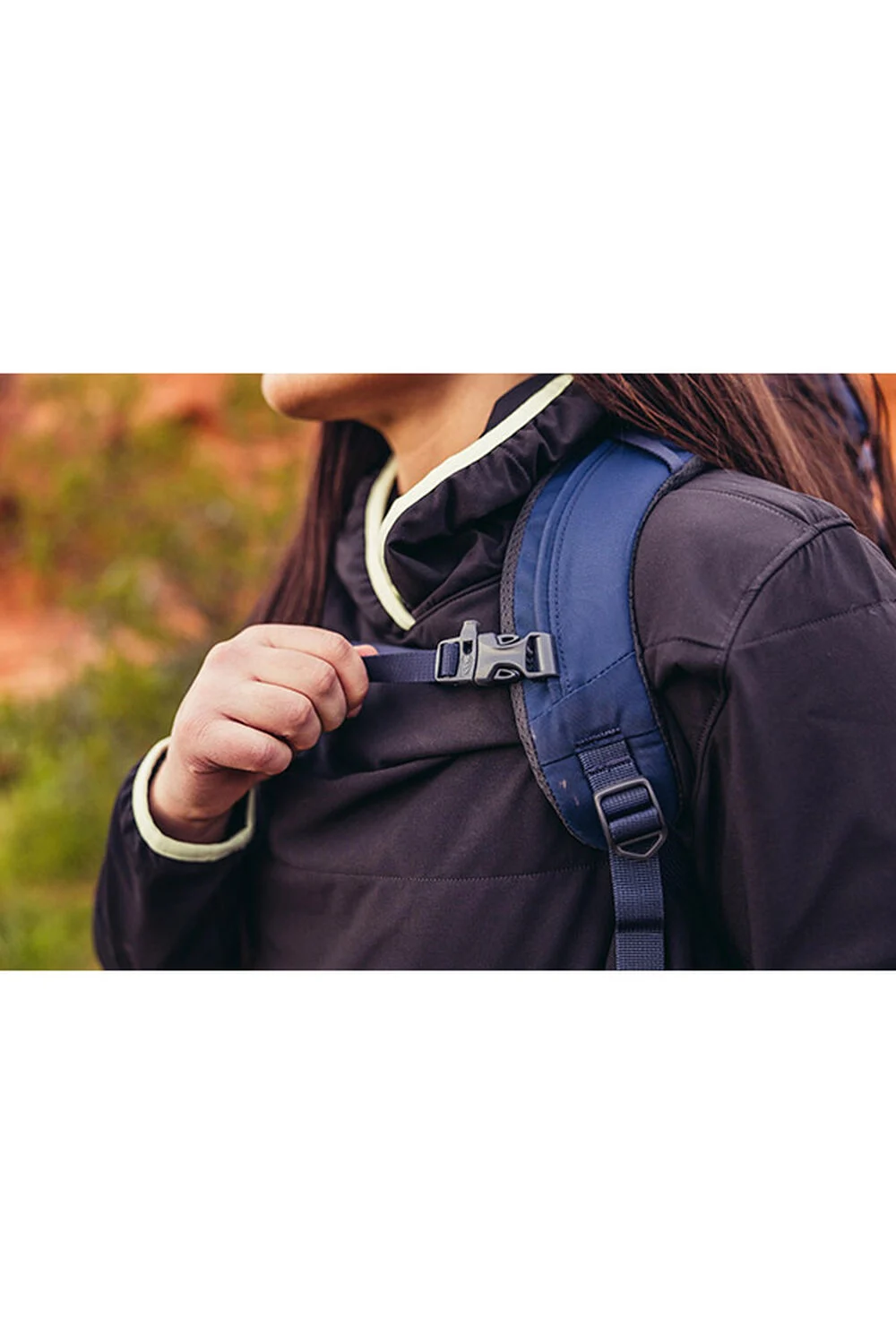 • Perforated, breathable shoulder harness with sternum strap featuring an integrated safety whistle