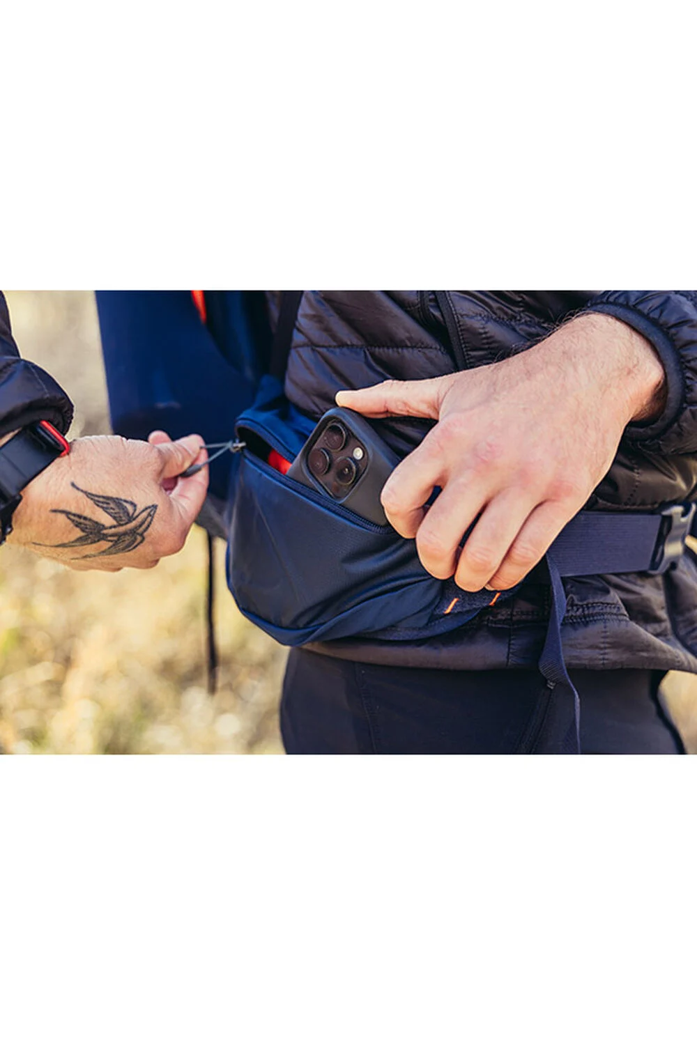 - On-The-Go shoulder strap pocket designed for the Garmin inReach®, your favorite trail snack, or sunglasses