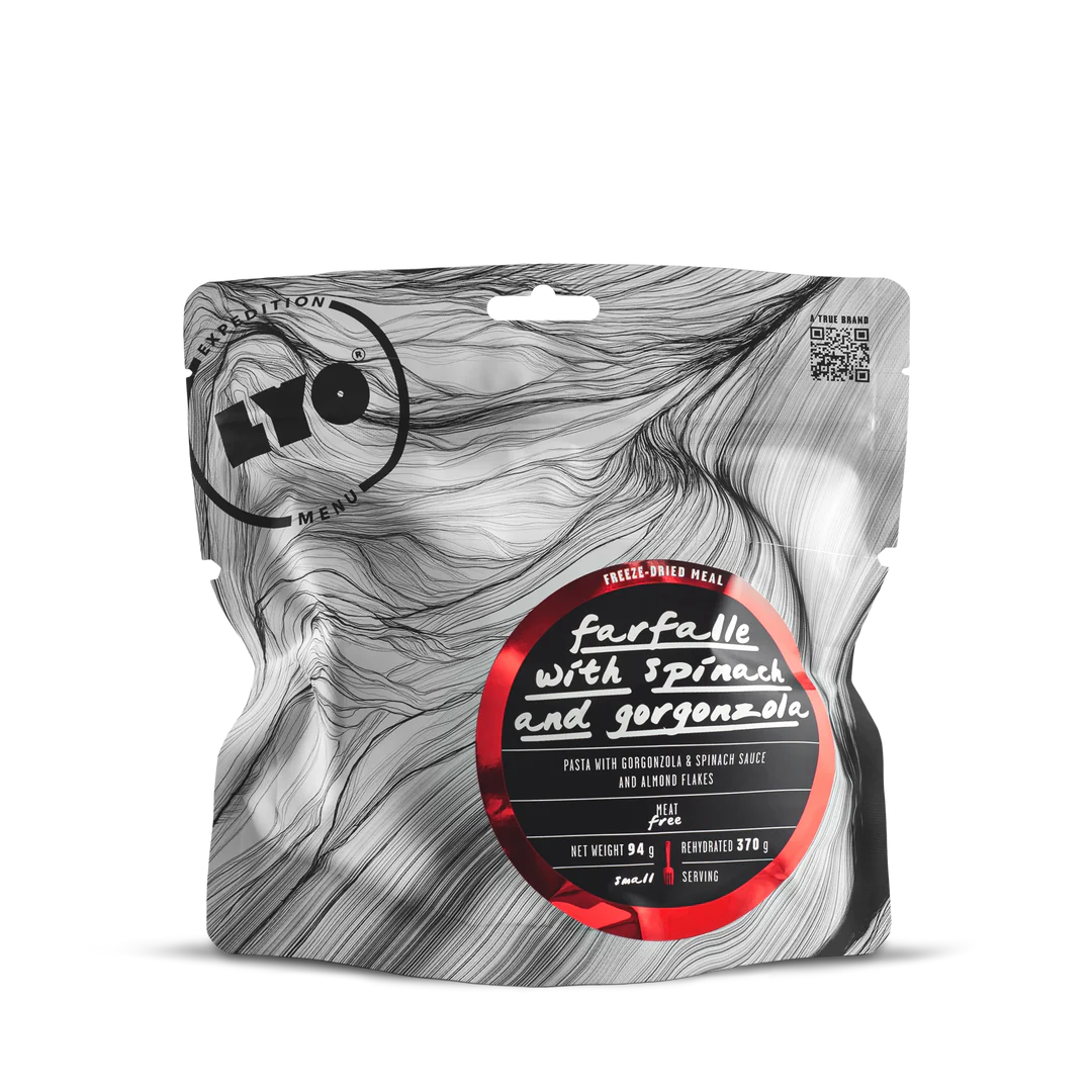 Farfalle, farfalloni, farfalline… it all means butterflies, smaller or larger! This beloved type of pasta is appreciated for its delicate surface and cheerful shape, which combines a thick center with thinner wings. It is said that the variety of textures makes farfalle especially well-suited for cream sauces, and we couldn’t agree more. We imagined them in a rather classic Italian entourage accompanied by spinach and Gorgonzola cheese, and garnished with almond flakes. Seems like we did it right as LYO Farfalle has been capturing the palates of adventure-hungry outdoor enthusiasts from day one, giving them butterflies wherever they go.