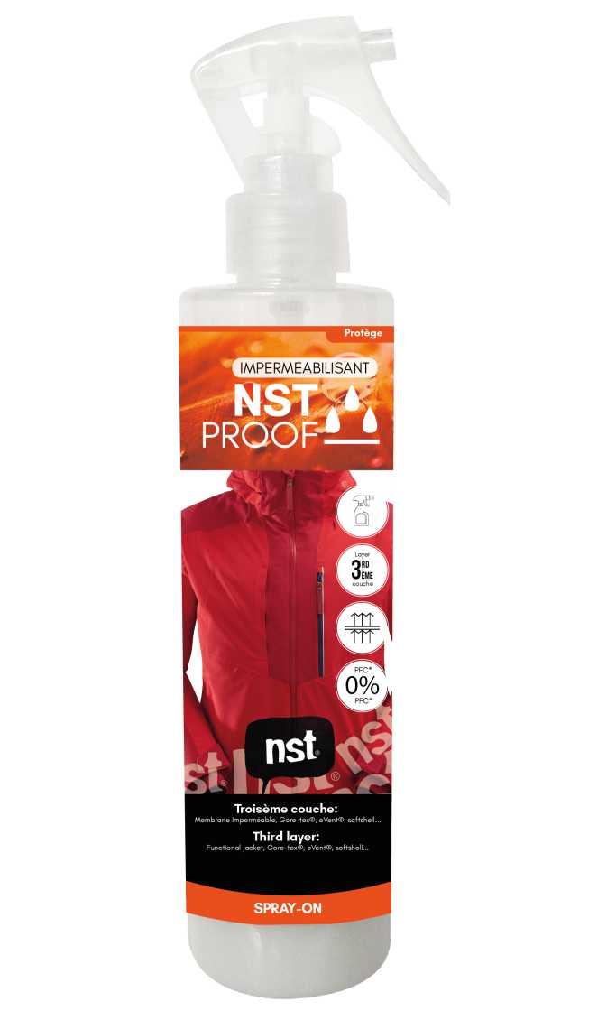 Nst Proof е импрегниращ препарат за спортни облекла или за екипировка, нуждаеща се от подновяване на dwr водоотблъскващото покритие. nst proof импрегнира материите в дълбочина и образува защитен слой върху повърността им, отблъскващ водата и замърсяванията.